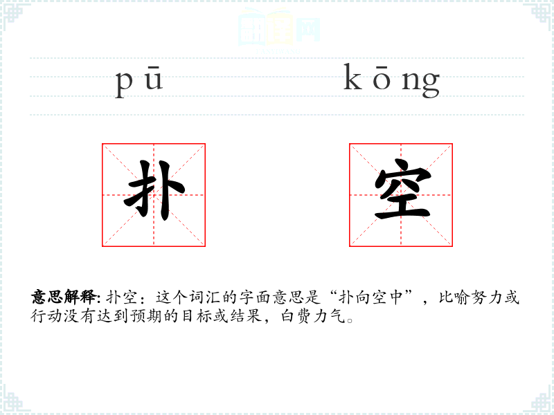 扑空:这个词汇的字面意思是“扑向空中”,比喻努力或行动没有达到预期的目标或结果,白费力气。