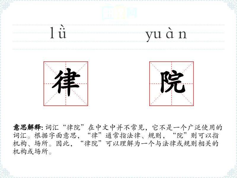 词汇“律院”在中文中并不常见,它不是一个广泛使用的词汇。根据字面意思,“律”通常指法律、规则,“院”则可以指机构、场所。因此,“律院”可以理解为一个与法律或规则相关的机构或场所。