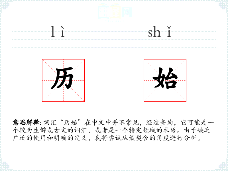 词汇“历始”在中文中并不常见,经过查询,它可能是一个较为生僻或古文的词汇,或者是一个特定领域的术语。由于缺乏广泛的使用和明确的定义,我将尝试从最契合的角度进行分析。