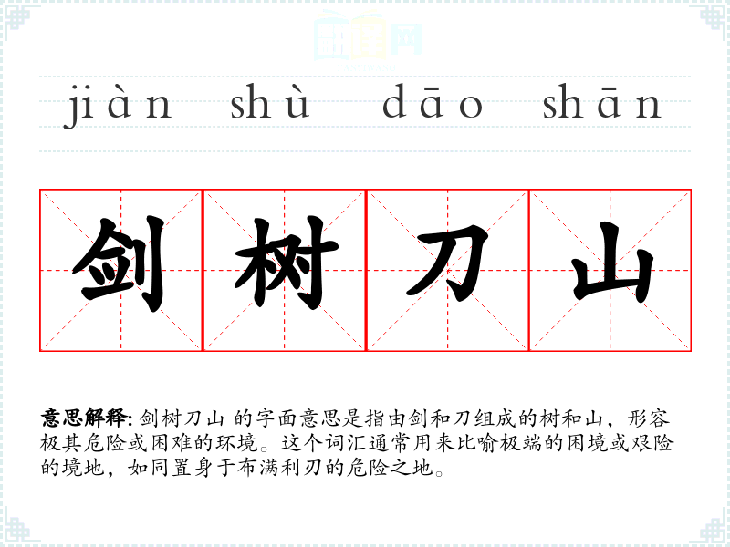 剑树刀山 的字面意思是指由剑和刀组成的树和山,形容极其危险或困难的环境。这个词汇通常用来比喻极端的困境或艰险的境地,如同置身于布满利刃的危险之地。