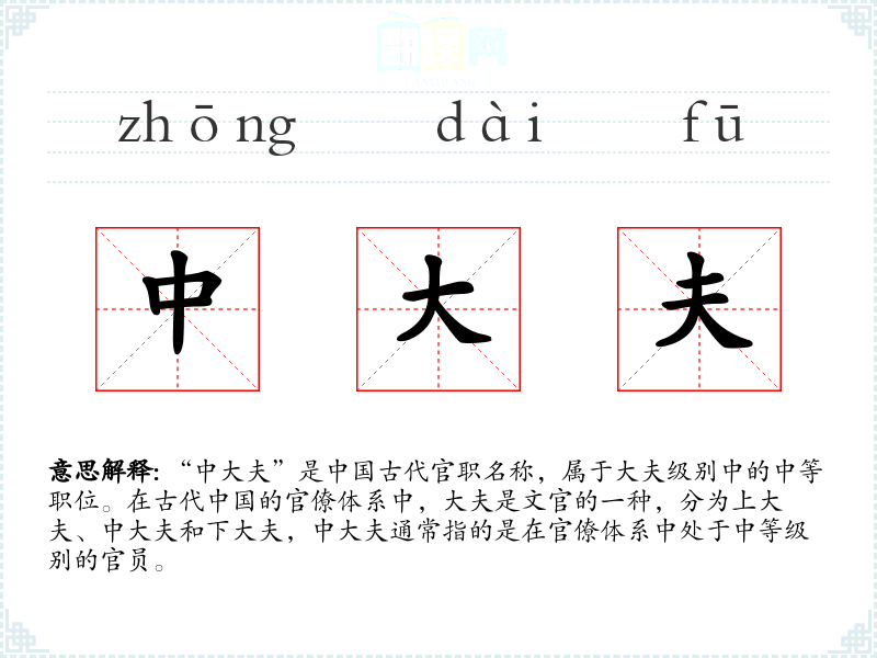 “中大夫”是古代官职名称,属于大夫级别中的中等职位。在古代的官僚体系中,大夫是文官的一种,分为上大夫、中大夫和下大夫,中大夫通常指的是在官僚体系中处于中等级别的官员。