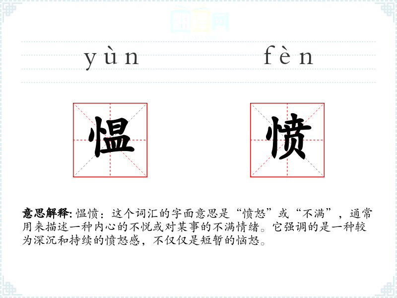 愠愤:这个词汇的字面意思是“愤怒”或“不满”,通常用来描述一种内心的不悦或对某事的不满情绪。它强调的是一种较为深沉和持续的愤怒感,不仅仅是短暂的恼怒。