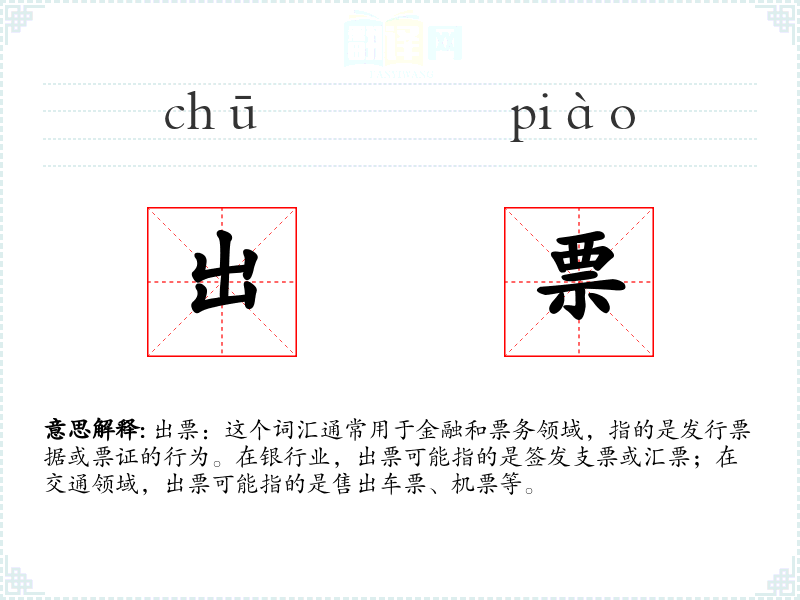 出票:这个词汇通常用于金融和票务领域,指的是发行票据或票证的行为。在银行业,出票可能指的是签发支票或汇票;在交通领域,出票可能指的是售出车票、机票等。