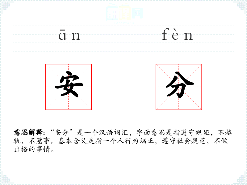 “安分”是一个汉语词汇,字面意思是指遵守规矩,不越轨,不惹事。基本含义是指一个人行为端正,遵守社会规范,不做出格的事情。