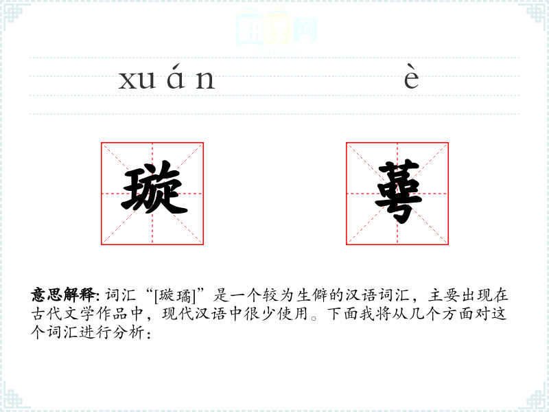 词汇“[璇璚]”是一个较为生僻的汉语词汇,主要出现在古代文学作品中,现代汉语中很少使用。下面我将从几个方面对这个词汇进行分析: