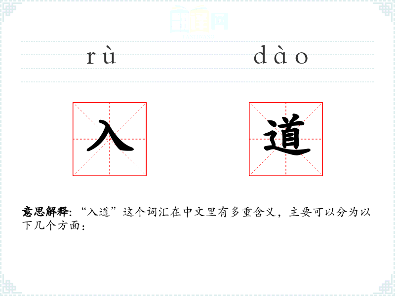 - **或哲学意义上的“入道”:指一个人开始修行,追求精神上的觉悟或道德上的提升,常见于、道教等语境中。