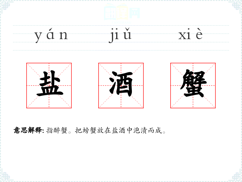 指醉蟹。把螃蟹放在盐酒中泡渍而成。