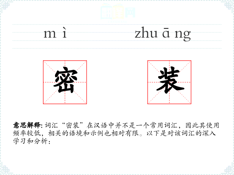 词汇“密装”在汉语中并不是一个常用词汇,因此其使用频率较低,相关的语境和示例也相对有限。以下是对该词汇的深入学习和分析: