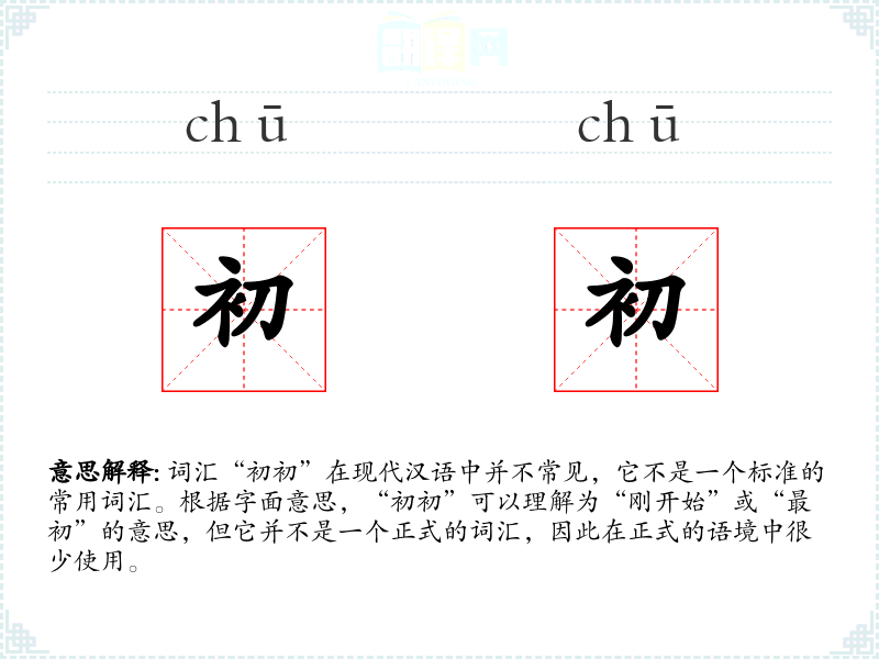词汇“初初”在现代汉语中并不常见,它不是一个标准的常用词汇。根据字面意思,“初初”可以理解为“刚开始”或“最初”的意思,但它并不是一个正式的词汇,因此在正式的语境中很少使用。
