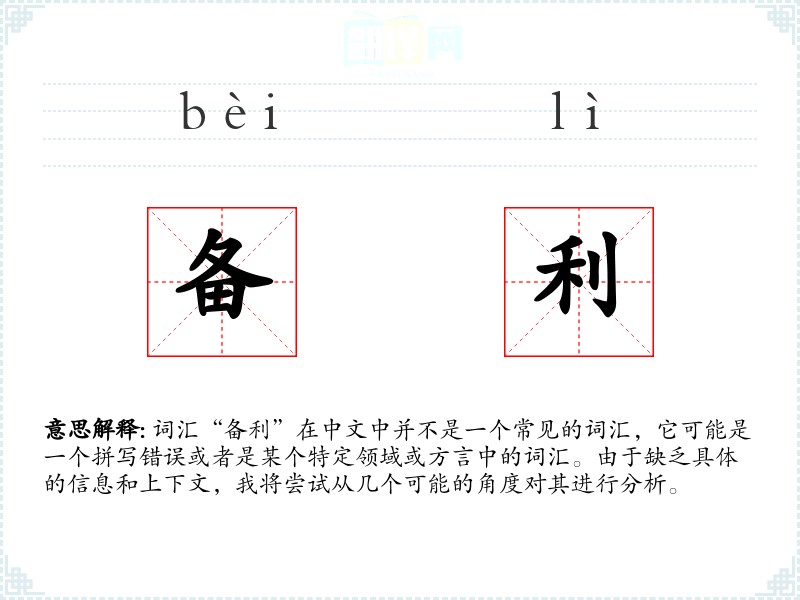词汇“备利”在中文中并不是一个常见的词汇,它可能是一个拼写错误或者是某个特定领域或方言中的词汇。由于缺乏具体的信息和上下文,我将尝试从几个可能的角度对其进行分析。