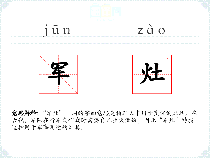 “军灶”一词的字面意思是指军队中用于烹饪的灶具。在古代,军队在行军或作战时需要自己生火做饭,因此“军灶”特指这种用于军事用途的灶具。