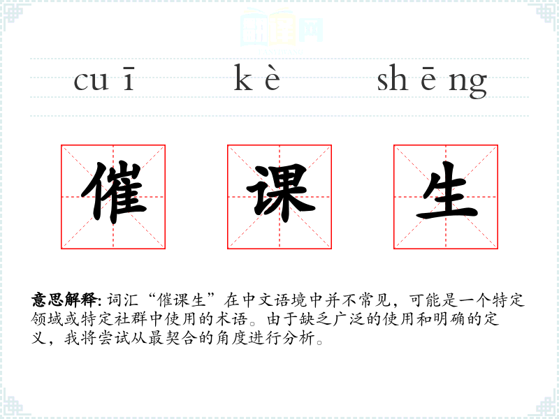 词汇“催课生”在中文语境中并不常见,可能是一个特定领域或特定社群中使用的术语。由于缺乏广泛的使用和明确的定义,我将尝试从最契合的角度进行分析。