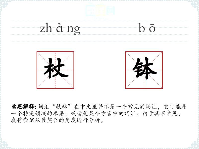 总的来说,由于“杖钵”不是一个标准词汇,对其进行深入学习和分析可能需要具体的上下文和领域知识。如果它在某个特定的领域或方言中使用,可能需要具体的上下文来探讨其意义和用法。