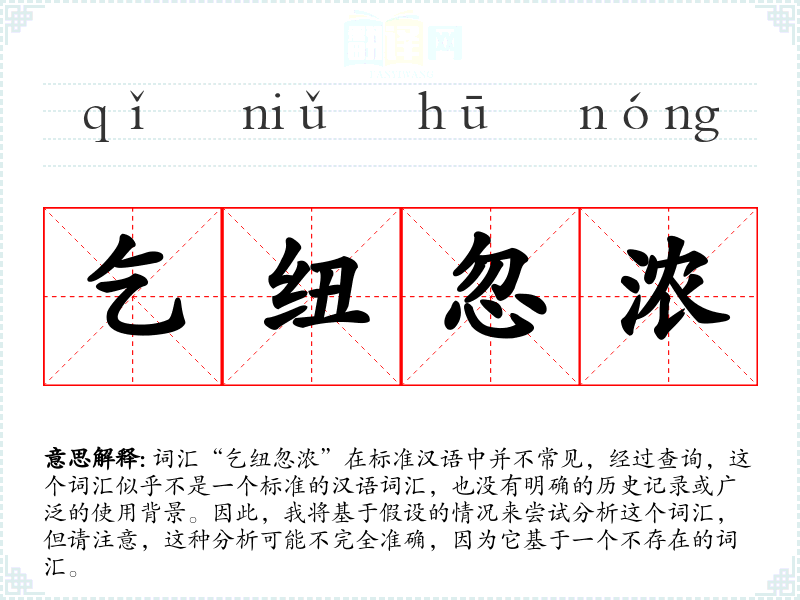 词汇“乞纽忽浓”在标准汉语中并不常见,经过查询,这个词汇似乎不是一个标准的汉语词汇,也没有明确的历史记录或广泛的使用背景。因此,我将基于假设的情况来尝试分析这个词汇,但请注意,这种分析可能不完全准确,因为它基于一个不存在的词汇。