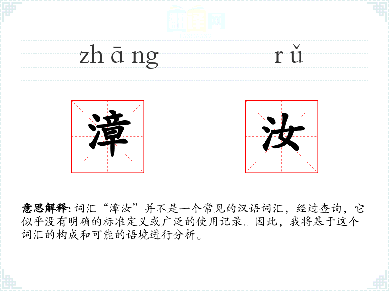 词汇“漳汝”并不是一个常见的汉语词汇,经过查询,它似乎没有明确的标准定义或广泛的使用记录。因此,我将基于这个词汇的构成和可能的语境进行分析。