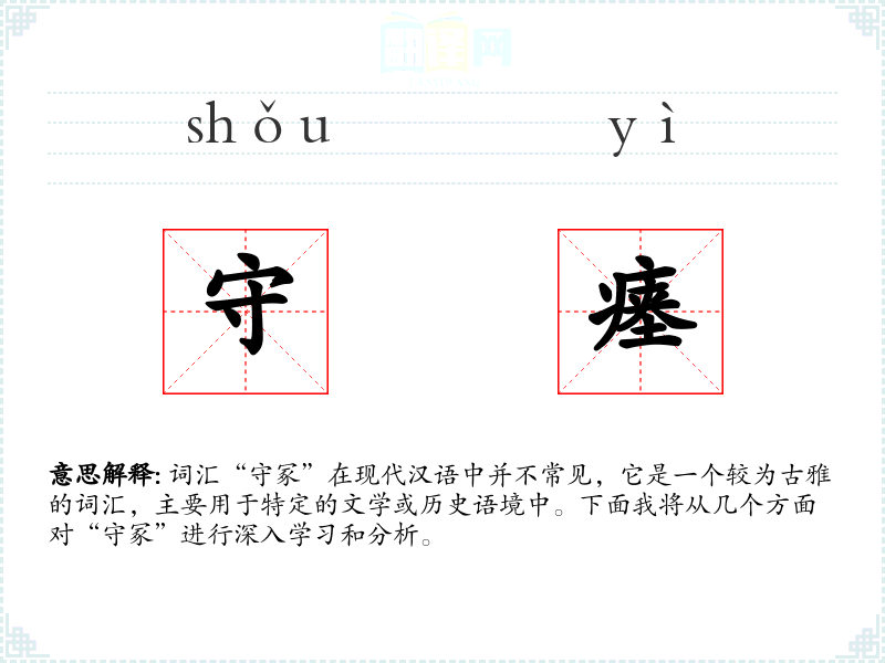 词汇“守冢”在现代汉语中并不常见,它是一个较为古雅的词汇,主要用于特定的文学或历史语境中。下面我将从几个方面对“守冢”进行深入学*和分析。