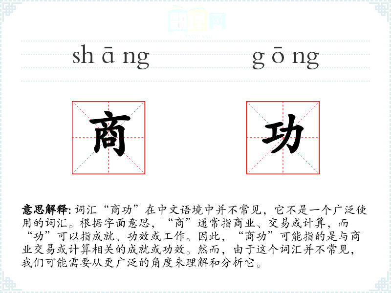 总的来说,“商功”是一个不常见的词汇,其含义和使用范围有限。在语言学习和表达中,它可能不是一个重要的词汇。然而,对于特定的商业领域或文化背景,了解和掌握这个词汇可能有助于更准确地表达商业成就和效益。