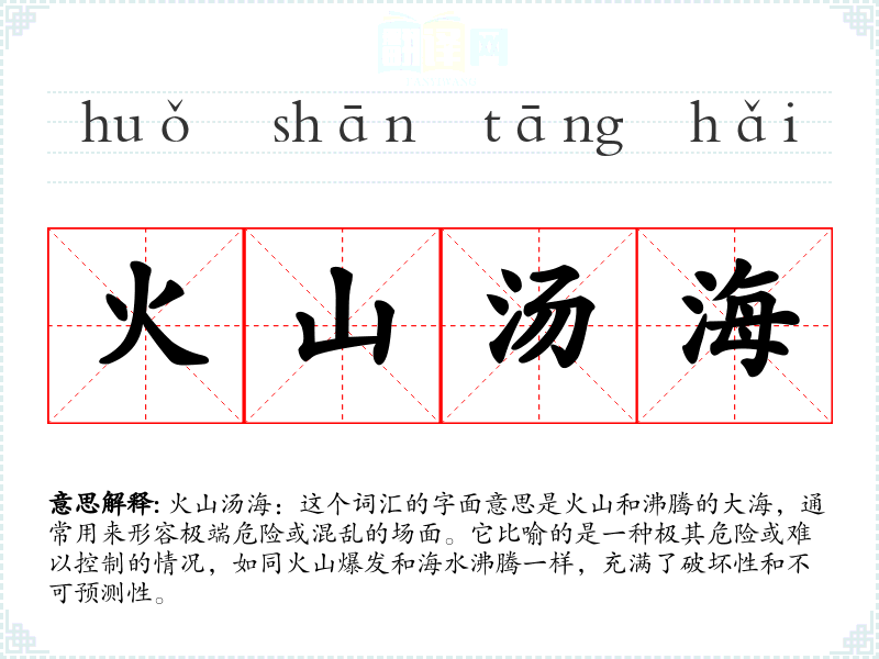 火山汤海:这个词汇的字面意思是火山和沸腾的大海,通常用来形容极端危险或混乱的场面。它比喻的是一种极其危险或难以控制的情况,如同火山爆发和海水沸腾一样,充满了破坏性和不可预测性。
