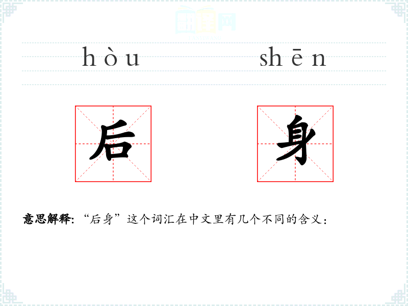 “后身”一词源于古代汉语,字面上的“后”指的是后面,而“身”指的是身体。随着时间的推移,这个词的含义逐渐扩展,包括了引申义。