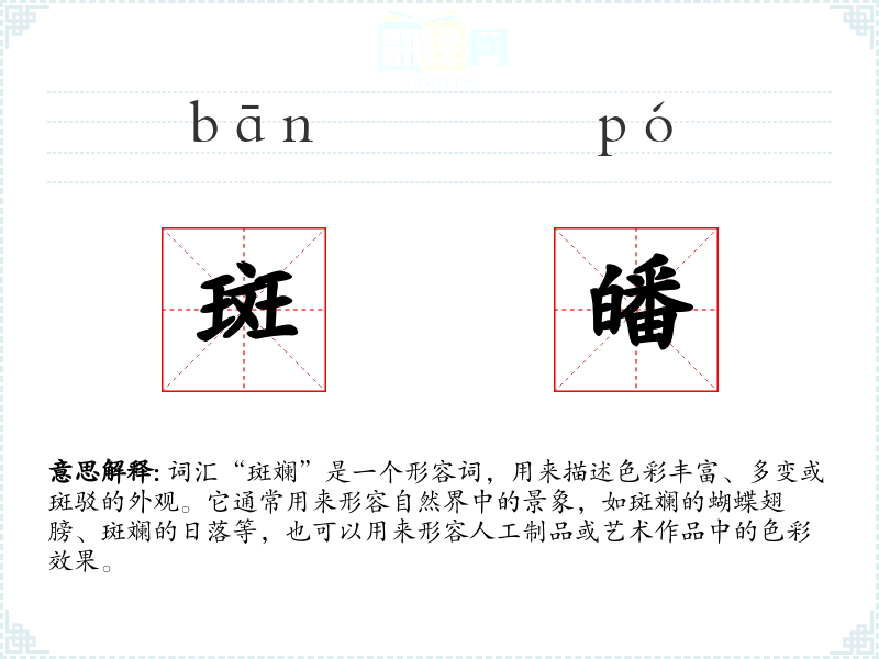 - 文学:在文学作品中,“斑斓”常用来描绘自然景观或艺术作品,如“斑斓的彩虹横跨天际”。
