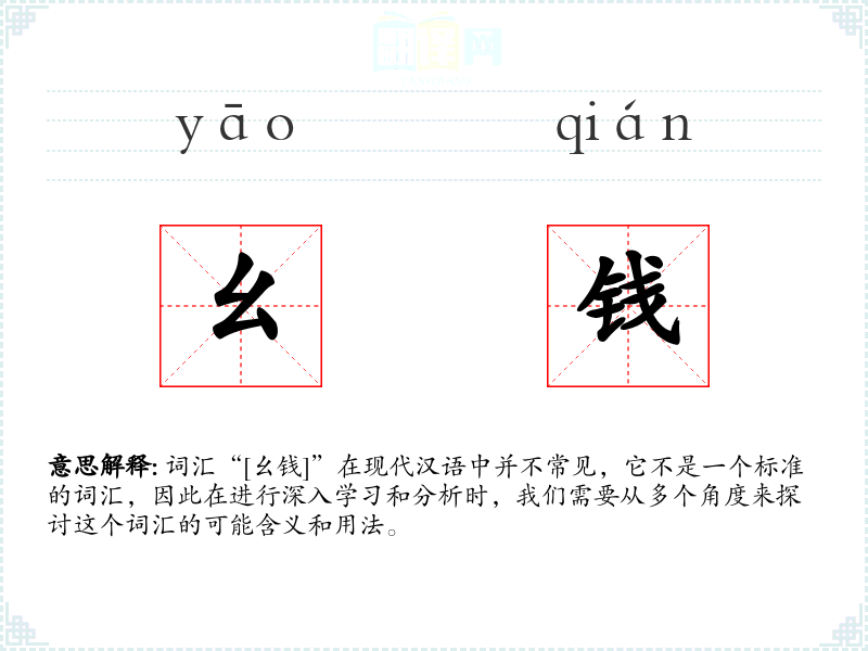 由于“[幺钱]”不是一个标准词汇,我们无法给出一个确切的字面意思和基本含义。它可能是某个方言中的词汇,或者是某个特定社群中的俚语。