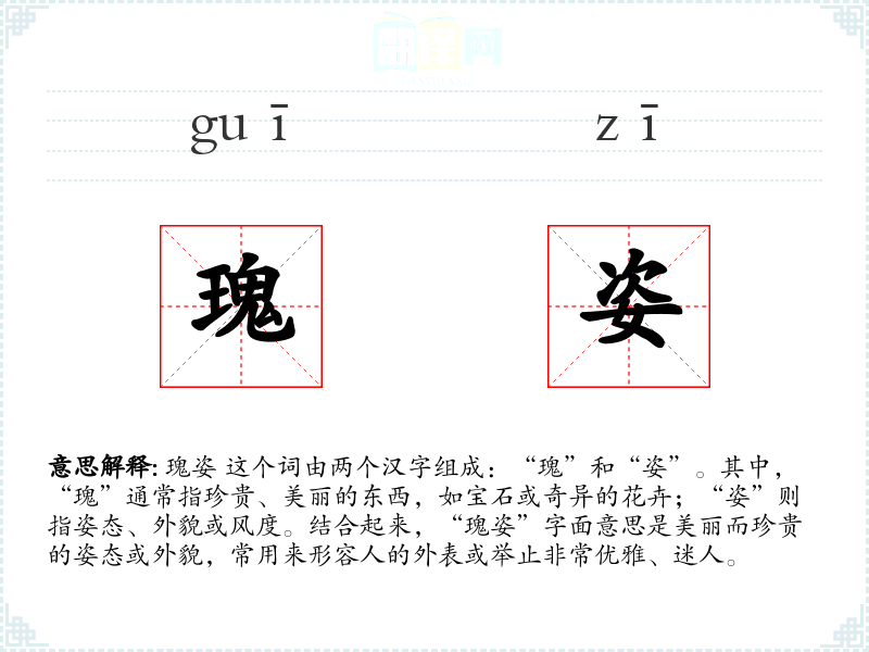在英语中,类似的词汇可能是“graceful beauty”或“elegant demeanor”,虽然这些词汇也能表达美丽和优雅,但“瑰姿”这个词在中文中特有的文化内涵和历史背景,使其在表达上更为丰富和精确。