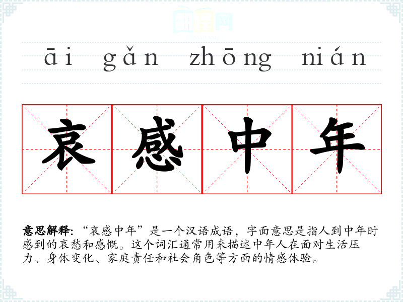 “哀感中年”这个词汇源自**古代文学,特别是在诗词中经常出现,用以表达中年人的情感状态。随着时间的推移,这个词汇逐渐被广泛应用于现代汉语中,用以描述中年人的普遍心理感受。