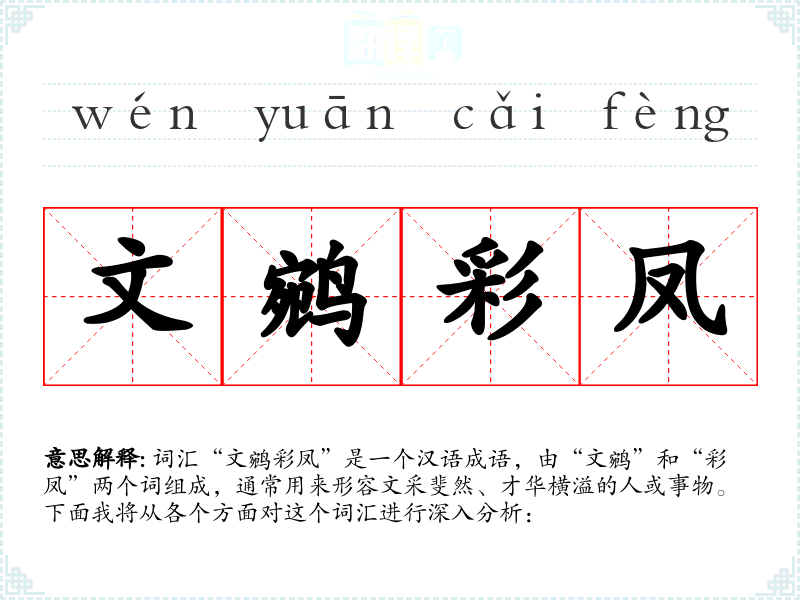 词汇“文鹓彩凤”是一个汉语成语,由“文鹓”和“彩凤”两个词组成,通常用来形容文采斐然、才华横溢的人或事物。下面我将从各个方面对这个词汇进行深入分析: