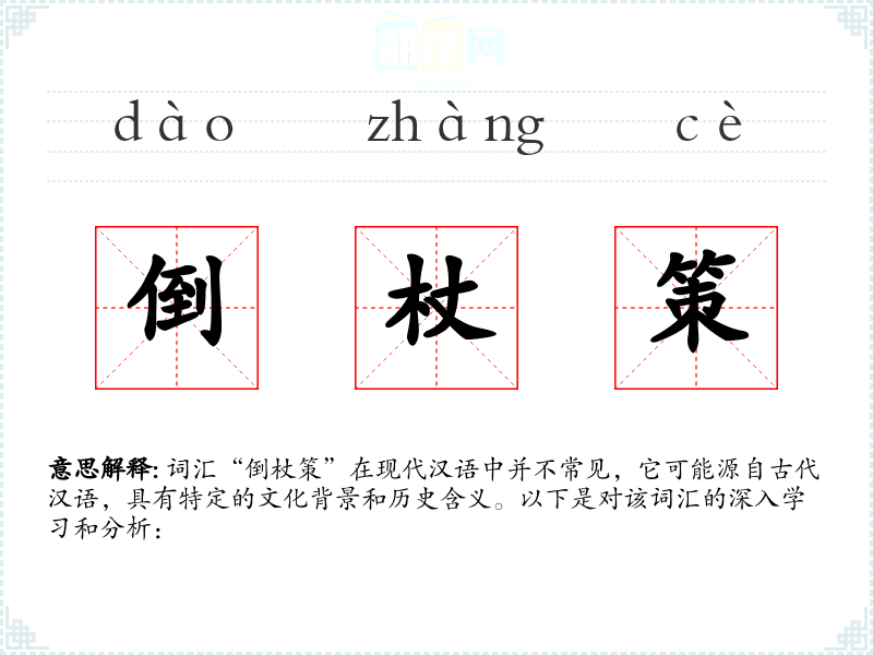 词汇“倒杖策”在现代汉语中并不常见,它可能源自古代汉语,具有特定的文化背景和历史含义。以下是对该词汇的深入学*和分析: