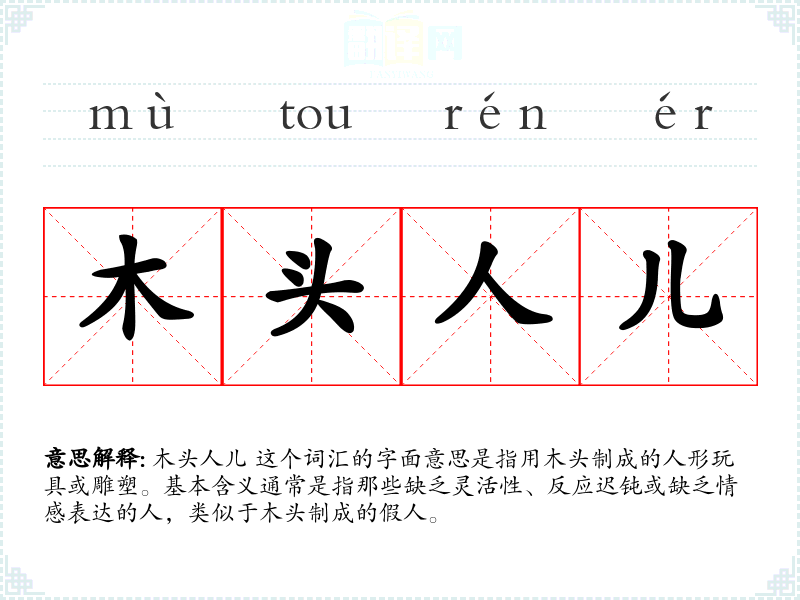 木头人儿 这个词汇的字面意思是指用木头制成的人形玩具或雕塑。基本含义通常是指那些缺乏灵活性、反应迟钝或缺乏情感表达的人,类似于木头制成的假人。