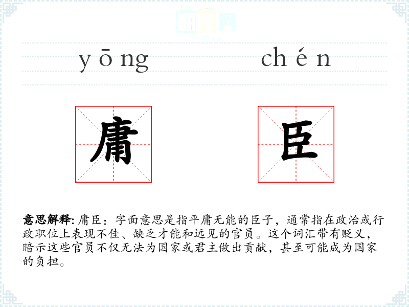 在文学作品中,“庸臣”常被用来讽刺那些只知迎合上意、缺乏独立思考和行动力的官员。在口语中,这个词可能被用来批评那些在工作中表现平庸、不求上进的人。在专业领域,如历史学或政治学,庸臣的概念可能被用来分析和评价历史上的政治人物。