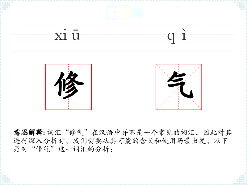 词汇“修气”在汉语中并不是一个常见的词汇,因此对其进行深入分析时,我们需要从其可能的含义和使用场景出发。以下是对“修气”这一词汇的分析: