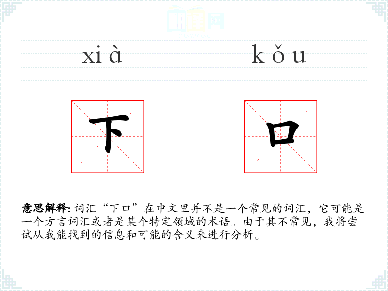 词汇“下口”在中文里并不是一个常见的词汇,它可能是一个方言词汇或者是某个特定领域的术语。由于其不常见,我将尝试从我能找到的信息和可能的含义来进行分析。