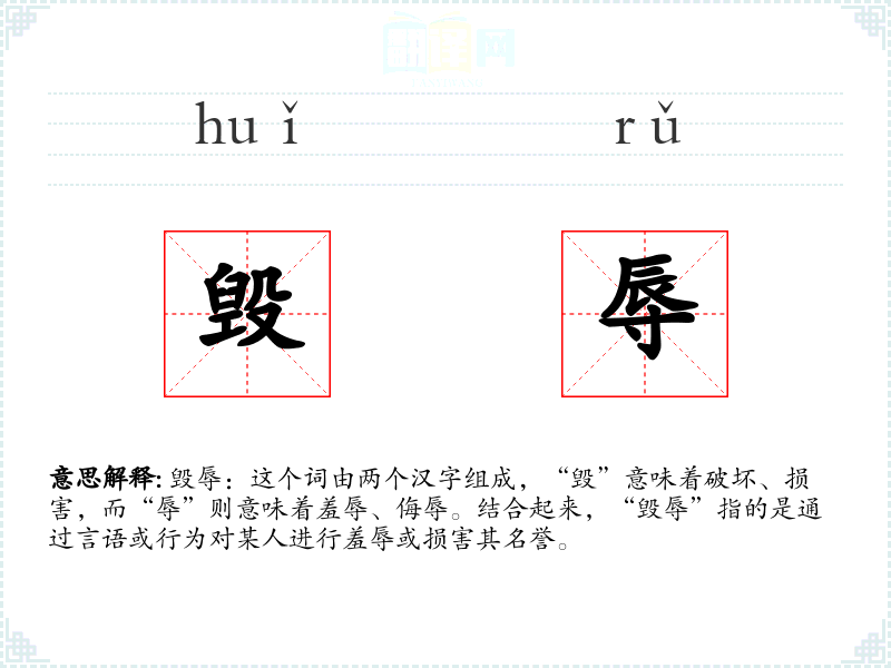 毁辱:这个词由两个汉字组成,“毁”意味着破坏、损害,而“辱”则意味着羞辱、侮辱。结合起来,“毁辱”指的是通过言语或行为对某人进行羞辱或损害其名誉。