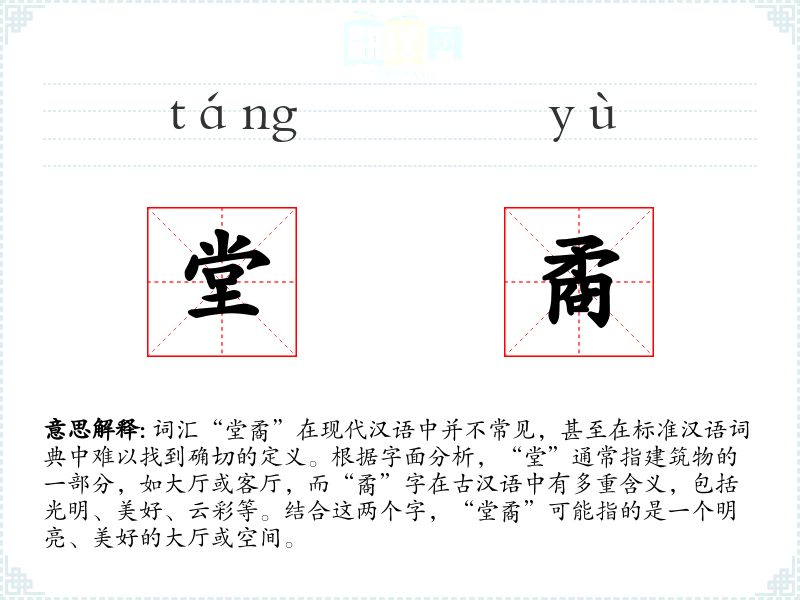 词汇“堂矞”在现代汉语中并不常见,甚至在标准汉语词典中难以找到确切的定义。根据字面分析,“堂”通常指建筑物的一部分,如大厅或客厅,而“矞”字在古汉语中有多重含义,包括光明、美好、云彩等。结合这两个字,“堂矞”可能指的是一个明亮、美好的大厅或空间。