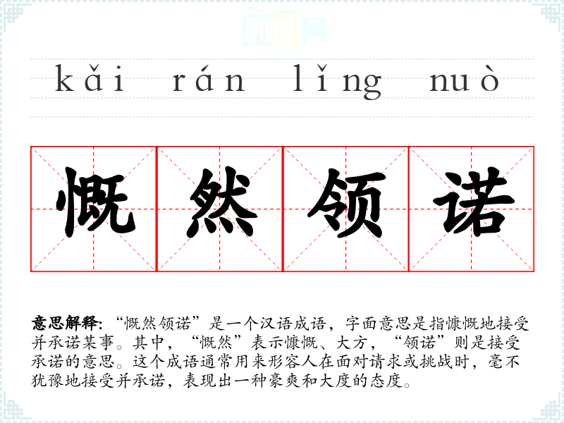 “慨然领诺”是一个汉语成语,字面意思是指慷慨地接受并承诺某事。其中,“慨然”表示慷慨、大方,“领诺”则是接受承诺的意思。这个成语通常用来形容人在面对请求或挑战时,毫不犹豫地接受并承诺,表现出一种豪爽和大度的态度。