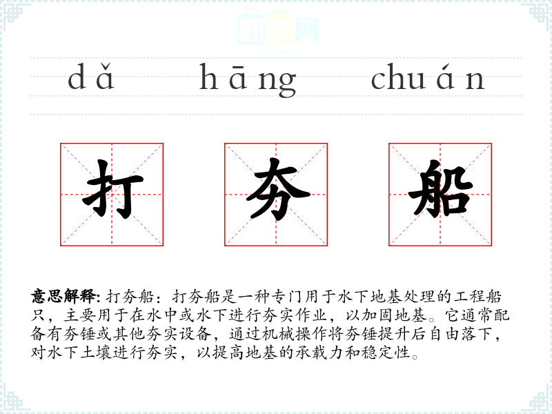 打夯船作为一个专业术语,虽然在日常生活中不常见,但在工程建设和基础处理领域具有重要意义。了解和掌握这一词汇,有助于更好地理解相关工程技术和作业流程,对于专业学习和实践具有重要价值。