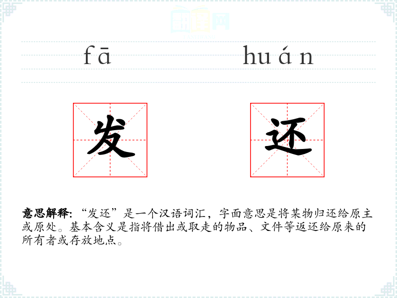 - 专业领域:在法律或行政领域,这个词常用于描述文件或物品的正式归还,如“法院决定将查封的财产发还给原主”。