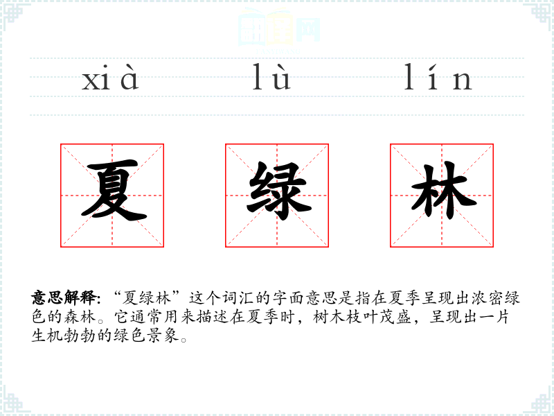 “夏绿林”这个词由“夏”和“绿林”组成,其中“夏”指的是夏季,“绿林”则指绿色的森林。这个词可能是现代汉语中为了描述特定季节的森林状态而创造的词汇。