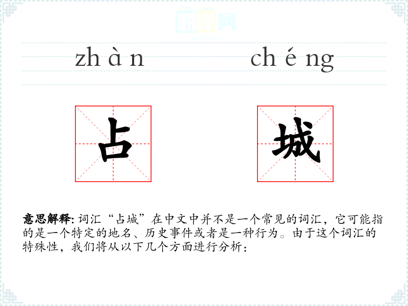 “占城”作为一个特定语境下的词汇,其使用和理解需要结合具体的历史和文化背景。在学*语言和表达时,了解这样的词汇可以帮助我们更深入地理解历史和文化。