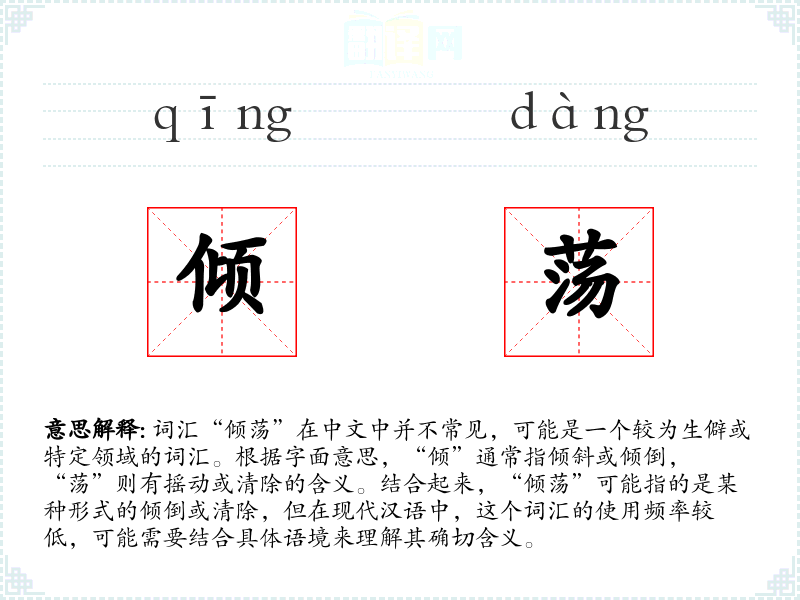 词汇“倾荡”在中文中并不常见,可能是一个较为生僻或特定领域的词汇。根据字面意思,“倾”通常指倾斜或倾倒,“荡”则有摇动或清除的含义。结合起来,“倾荡”可能指的是某种形式的倾倒或清除,但在现代汉语中,这个词汇的使用频率较低,可能需要结合具体语境来理解其确切含义。