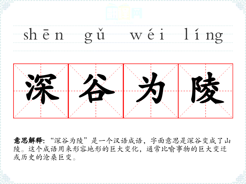 “深谷为陵”这个成语不仅描述了自然界的地形变化,也深刻反映了历史的变迁和人生的无常。在语言学*和表达中,它是一个富有哲理和美感的词汇,能够丰富我们的表达和思考。