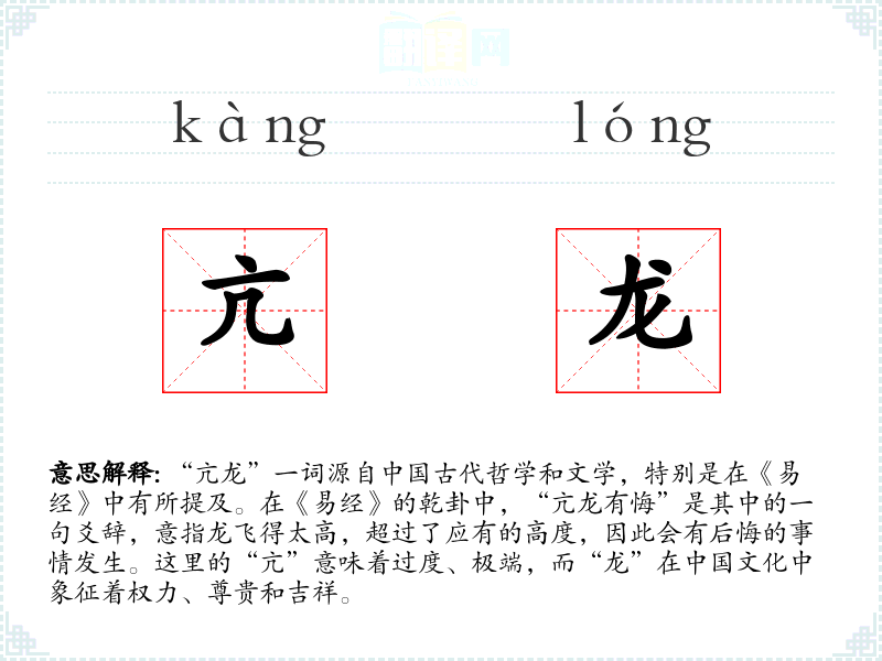 “亢龙”一词源自古代哲学和文学,特别是在《易经》中有所提及。在《易经》的乾卦中,“亢龙有悔”是其中的一句爻辞,意指龙飞得太高,超过了应有的高度,因此会有后悔的事情发生。这里的“亢”意味着过度、极端,而“龙”在文化中象征着权力、尊贵和吉祥。