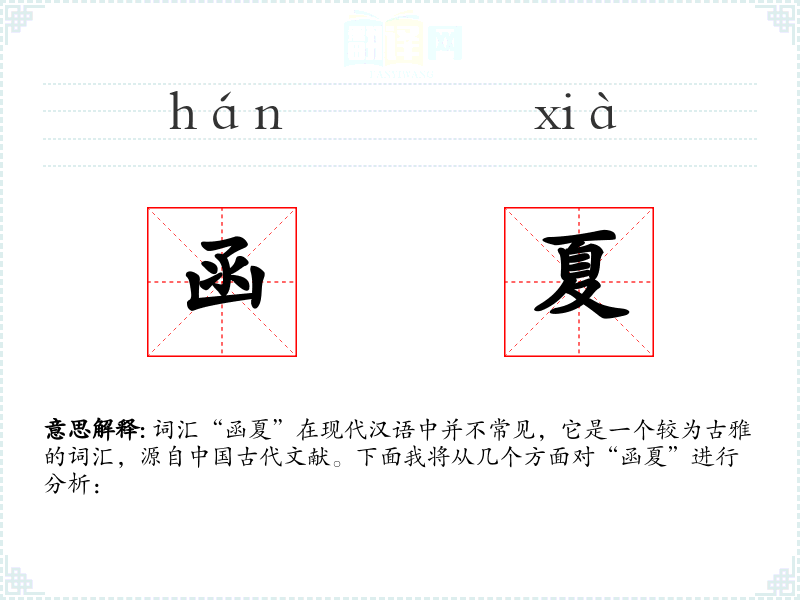 词汇“函夏”在现代汉语中并不常见,它是一个较为古雅的词汇,源自**古代文献。下面我将从几个方面对“函夏”进行分析: