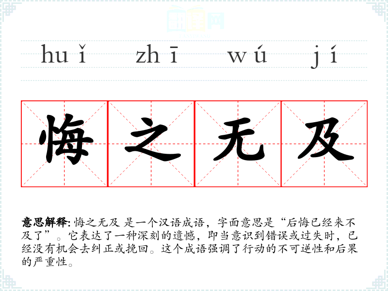 悔之无及 是一个汉语成语,字面意思是“后悔已经来不及了”。它表达了一种深刻的遗憾,即当意识到错误或过失时,已经没有机会去纠正或挽回。这个成语强调了行动的不可逆性和后果的严重性。