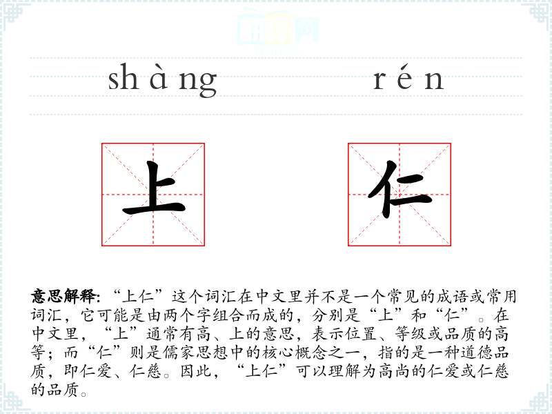 “上仁”这个词汇的词源可能直接来源于中文的“上”和“仁”两个字。在儒家经典中,“仁”是一个核心概念,而“上”则用来强调其高尚和卓越。随着时间的推移,这个词汇可能没有发生太大的变化,因为它不是一个常用的复合词。