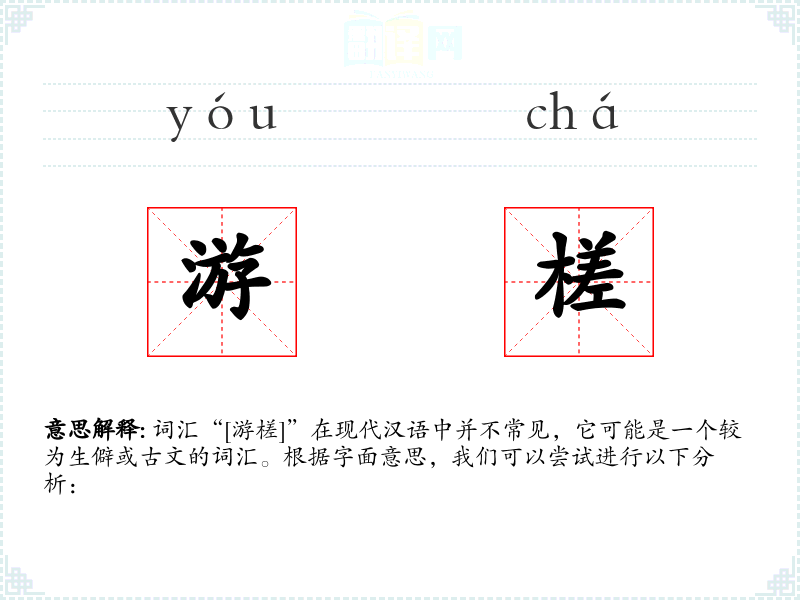词汇“[游槎]”在现代汉语中并不常见,它可能是一个较为生僻或古文的词汇。根据字面意思,我们可以尝试进行以下分析: