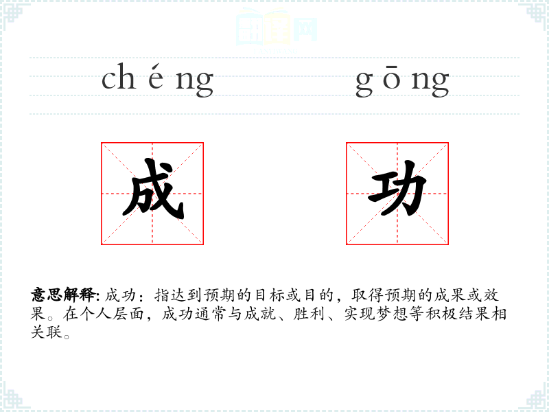 成功:指达到预期的目标或目的,取得预期的成果或效果。在个人层面,成功通常与成就、胜利、实现梦想等积极结果相关联。