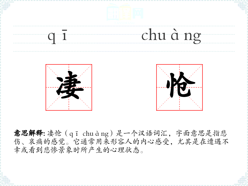 凄怆(qī chuàng)是一个汉语词汇,字面意思是指悲伤、哀痛的感觉。它通常用来形容人的内心感受,尤其是在遭遇不幸或看到悲惨景象时所产生的心理状态。