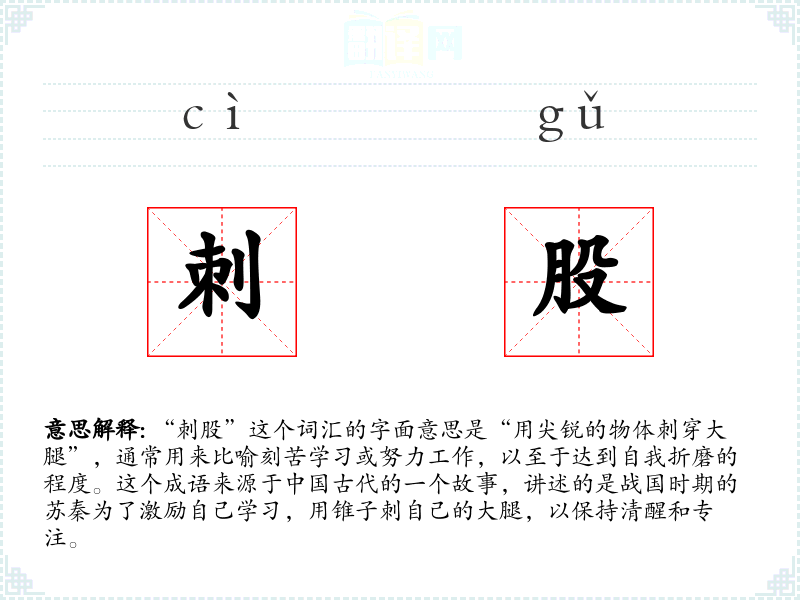 “刺股”这个词汇的字面意思是“用尖锐的物体刺穿大腿”,通常用来比喻刻苦学*或努力工作,以至于达到自我折磨的程度。这个成语来源于*古代的一个故事,讲述的是战国时期的苏秦为了激励自己学,用锥子刺自己的大腿,以保持清醒和专注。